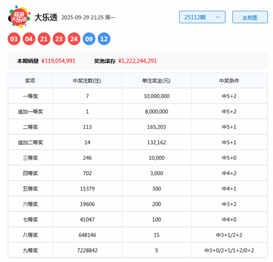 大乐透第2025112期开奖,前区:03、04、21、23、24;后区:09、12。其中前区012路比为3:1:1,奇偶比为3:2,和值为75,跨度为21,后区开出0路+0路号码。