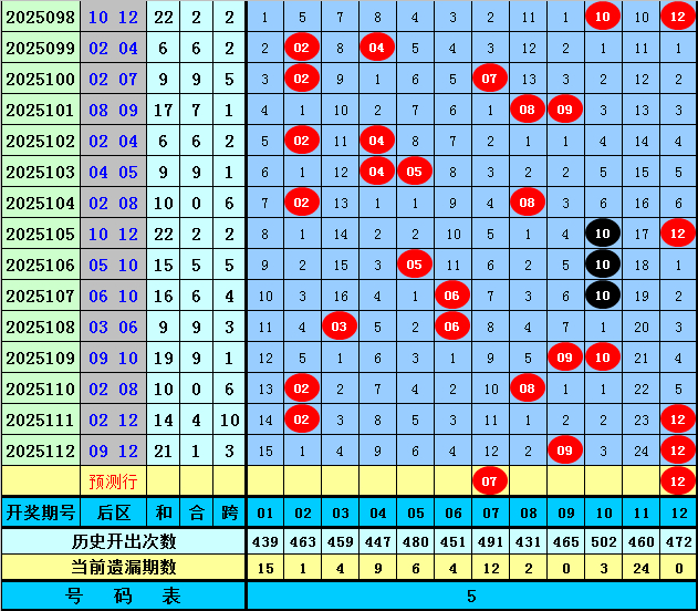 后区5码推荐:04、07、10、11、12