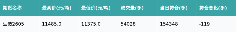 南财智讯2月26日电,盘后期货数据显示,大连商品交易所的生猪主力合约收跌0.13%,收盘报11395.0元/吨,日内资金流出3115.19万元。其他相关指标见下表: